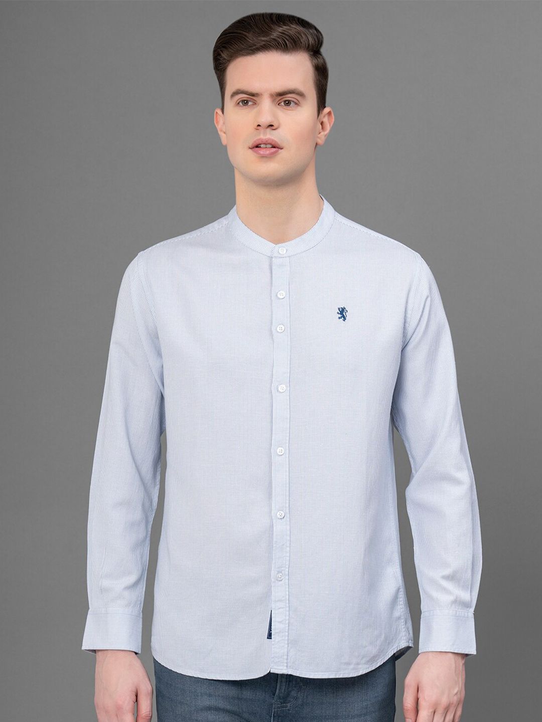 Men Mandarin Collar Opaque Striped Casual Shirt