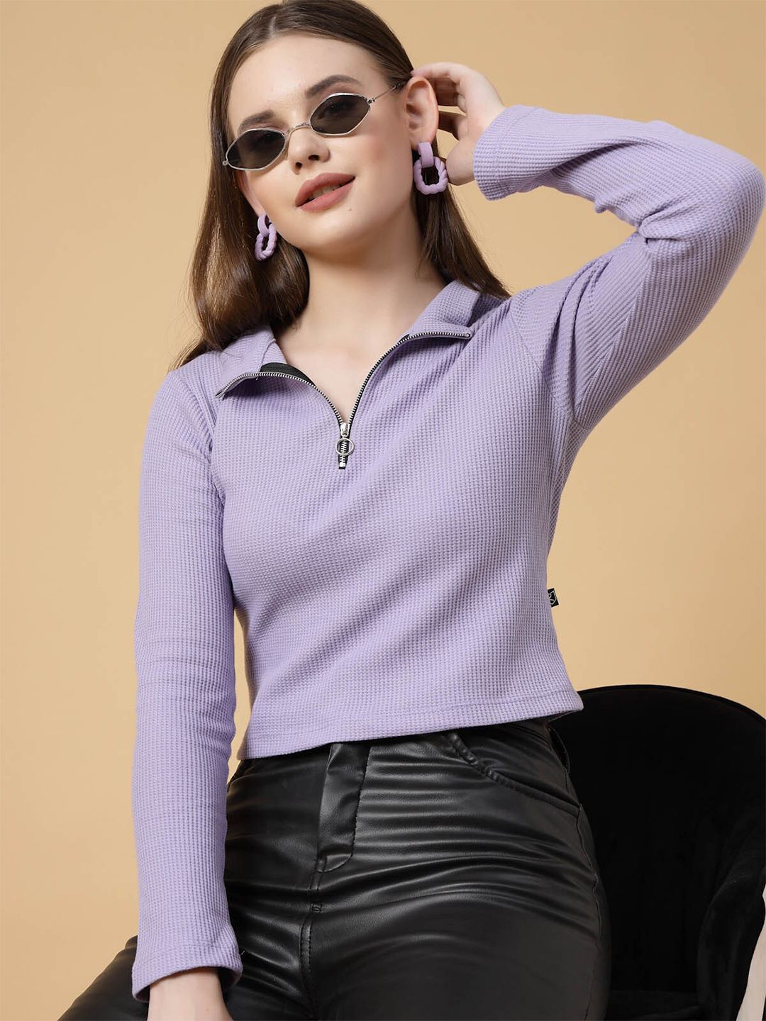 The Life style Co. Lavender Shirt Collar Long Sleeves Crop Top