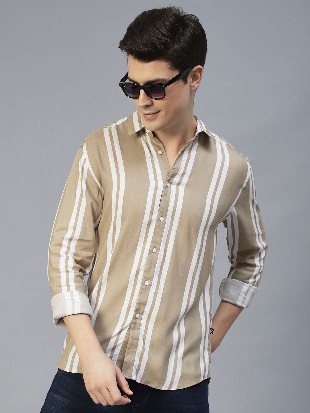Men Beige Slim Fit Striped Casual Shirt