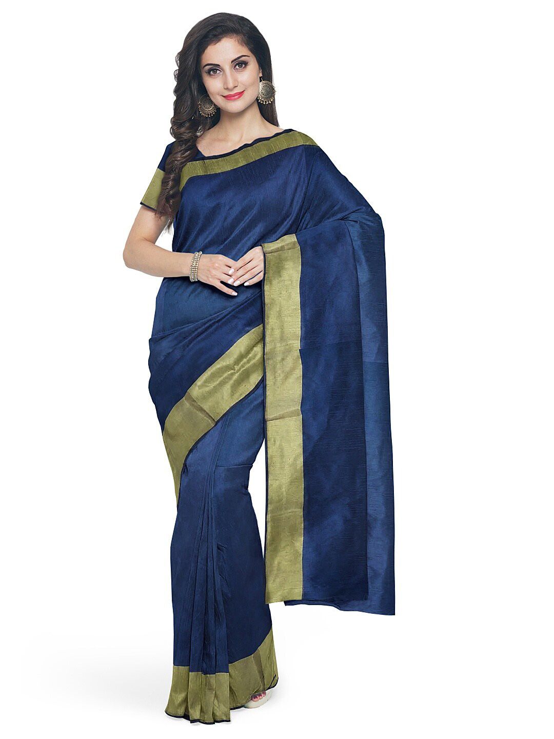 Blue & Grey Silk Cotton Silk Plain Saree With Un-Stitched Blouse