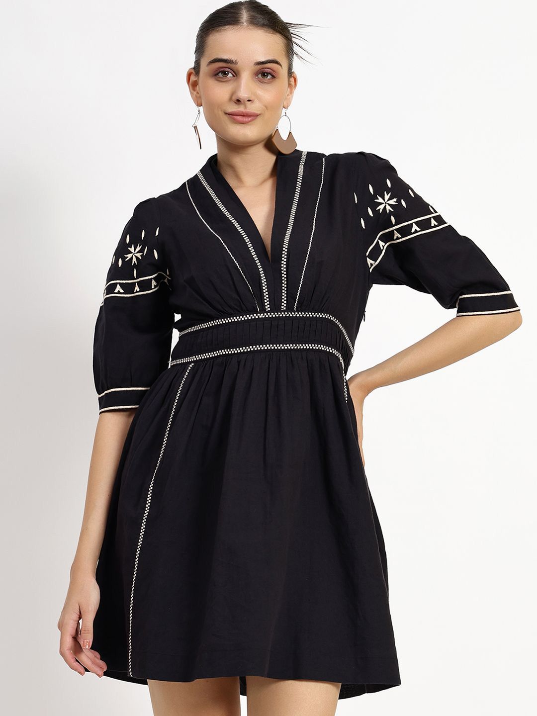 Black Embroidered A-Line Pure Cotton Top
