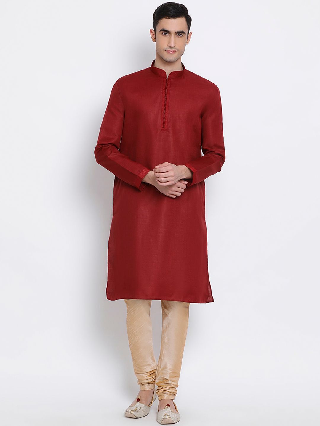 Men Maroon & Gold-Coloured Solid Silk Kurta with Churidar