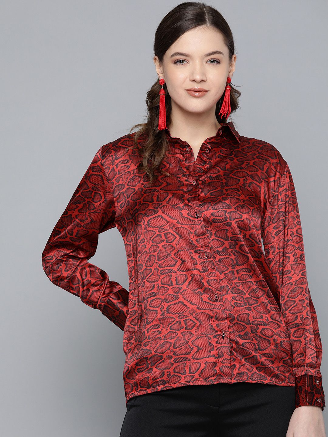 Maroon Relaxed Spread Collar Satin Casual Shirt