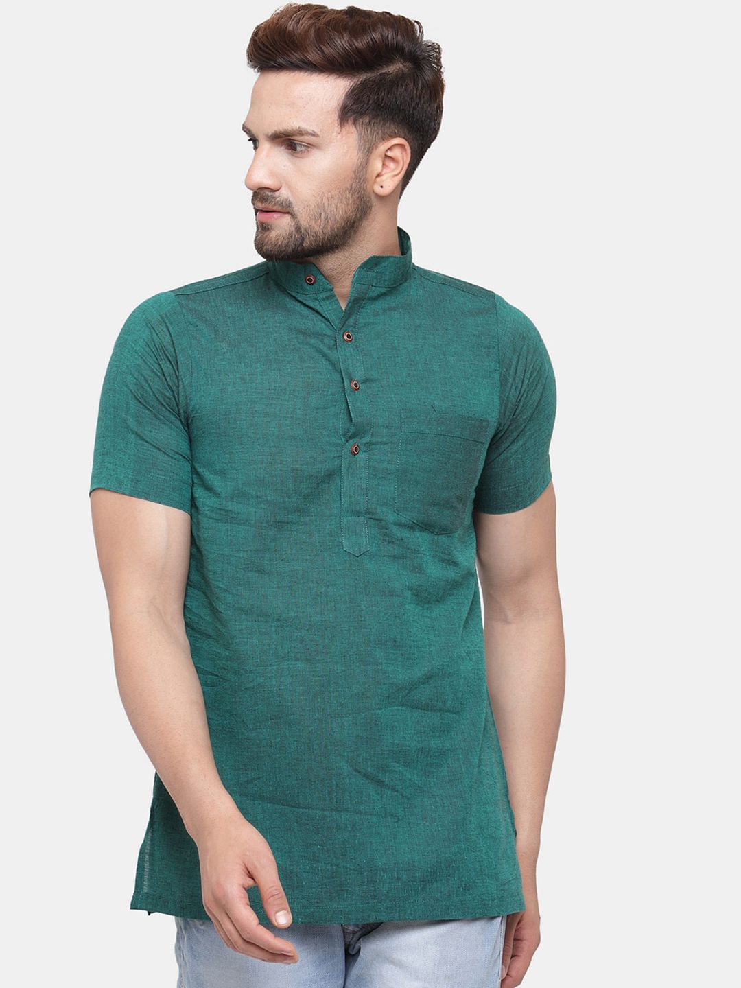 Men Green Solid Cotton Short Kurta