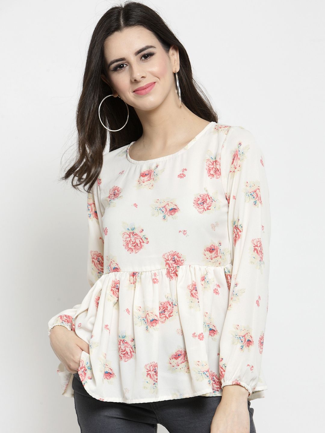 Off White Floral Printed Full Sleeves Top