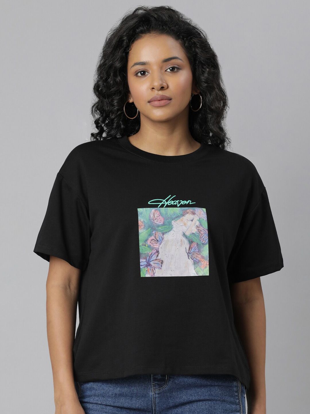 HERENOW Women Black Printed Pure Cotton T-shirt