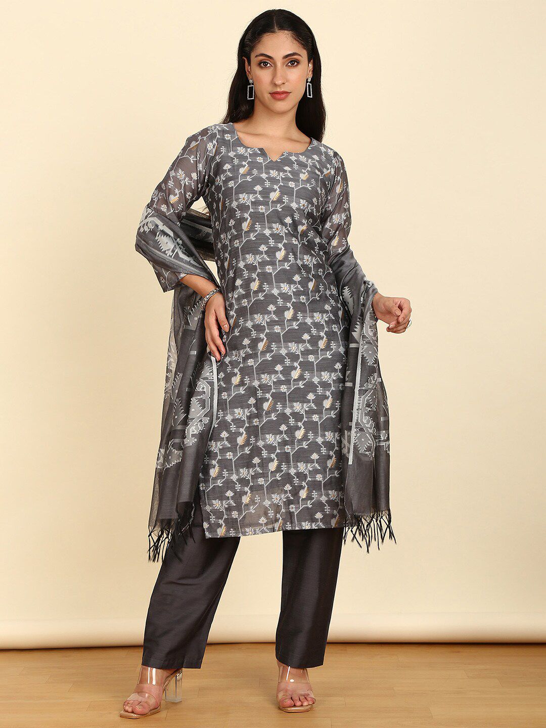 Women Grey Ethnic Motifs Printed Beads and Stones Pure Cotton Kurta with Trousers & With Dupatta