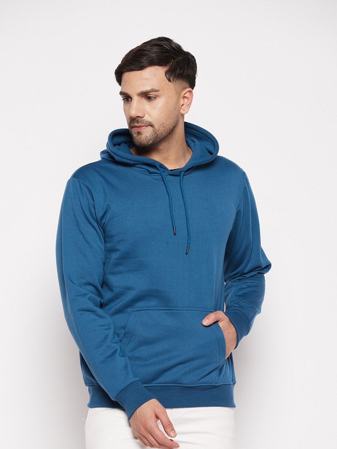 Men Teal Blue Solid Pure Cotton Hooded Sweatshirt