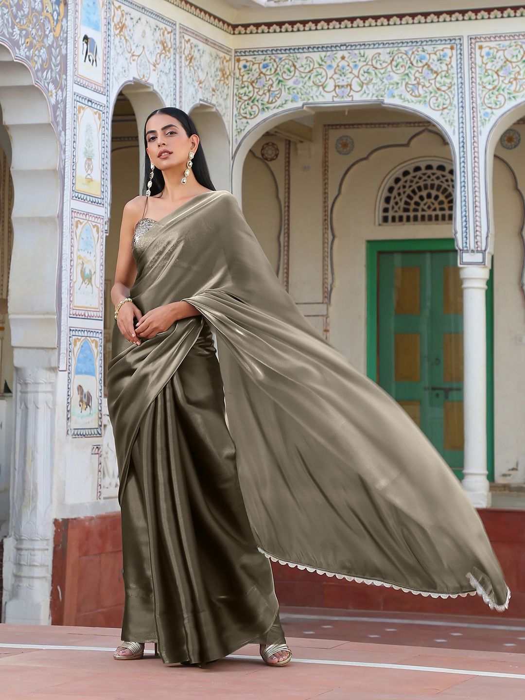 Grey & Gold Embroidered Silk Blend Saree With Blouse Piece