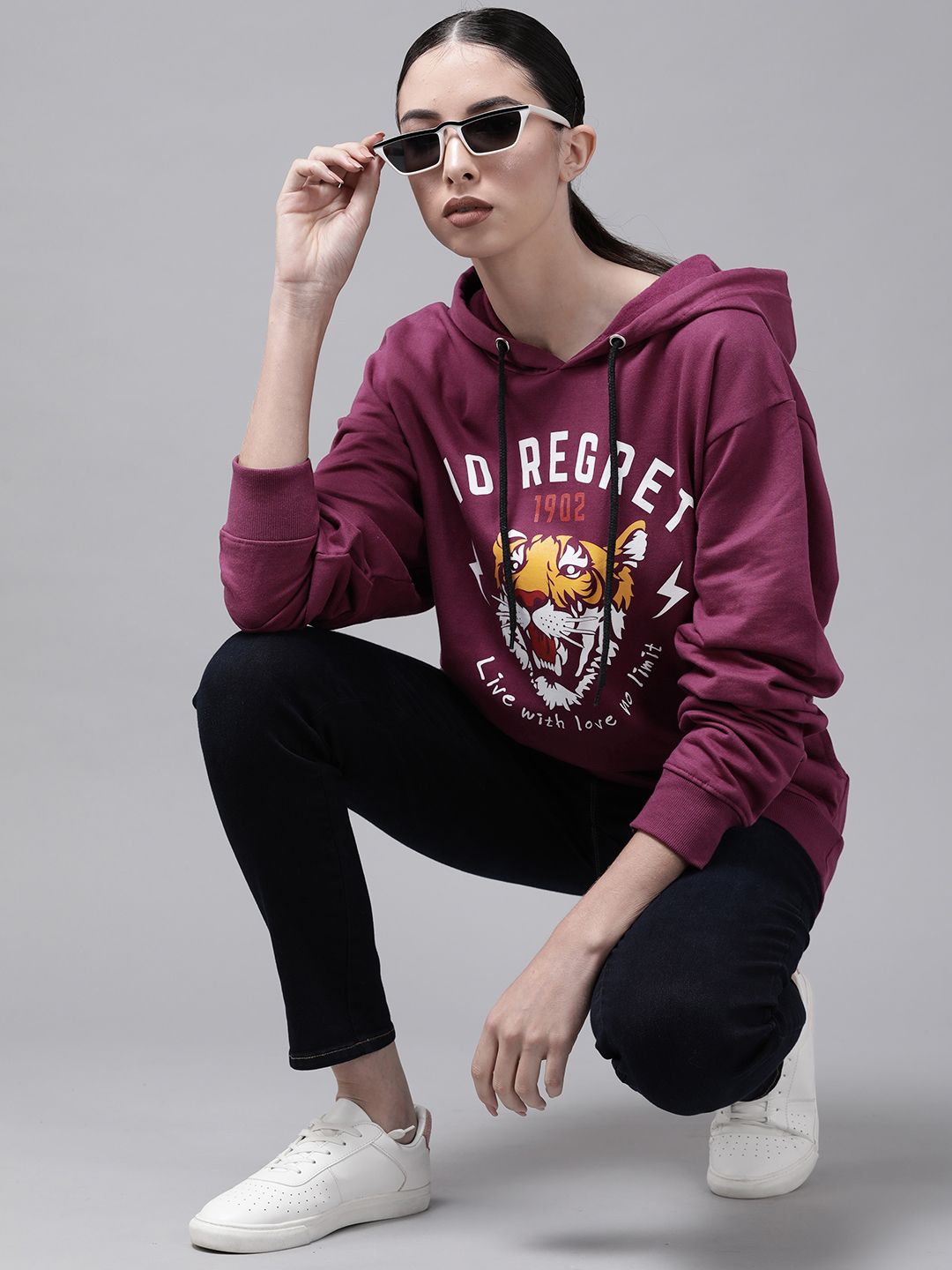 The Lifestyle Co. Women Maroon Graphic Printed Hooded Sweatshirt