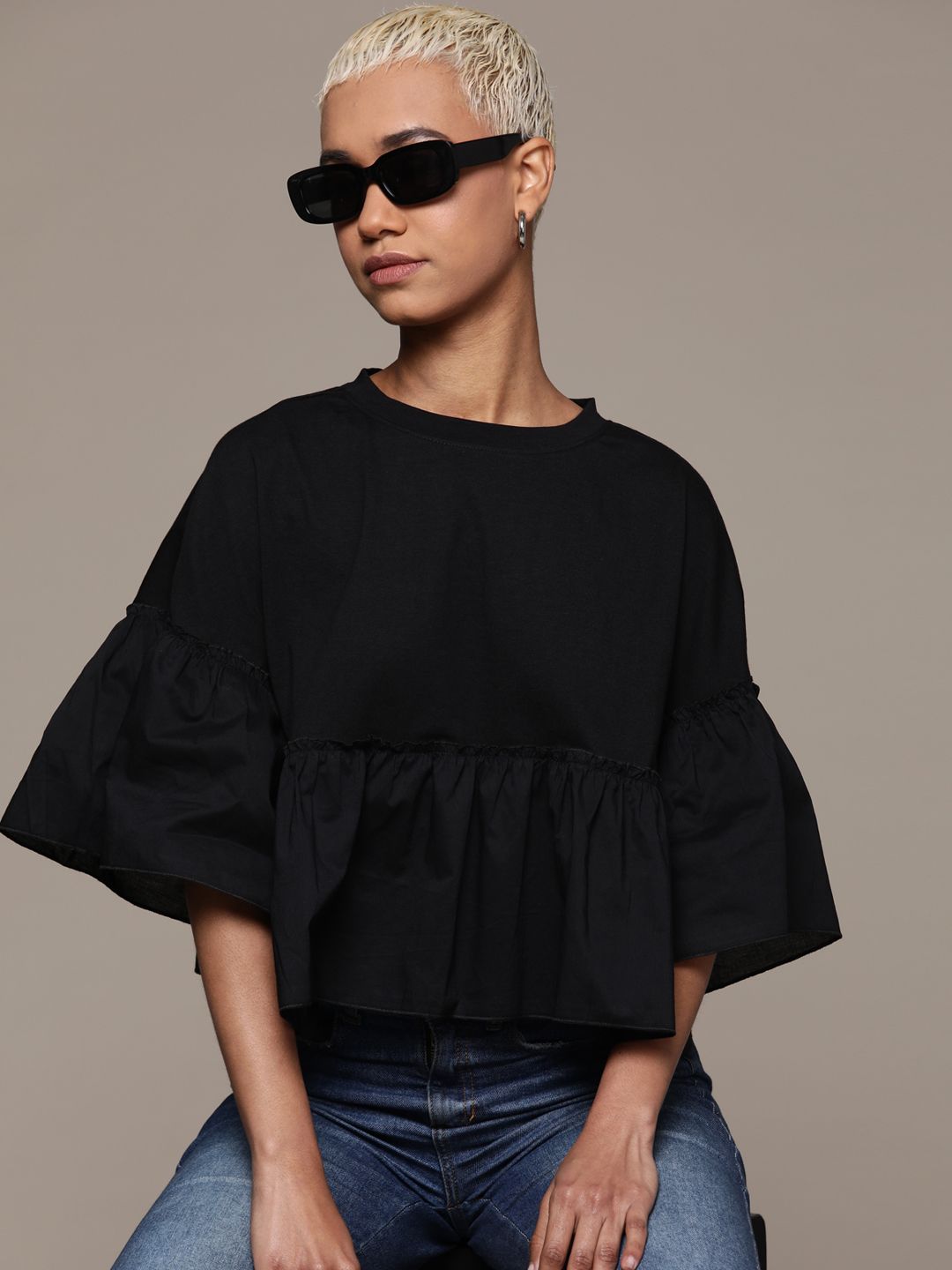 Women Black Solid One Shoulder Ruffles Georgette Top