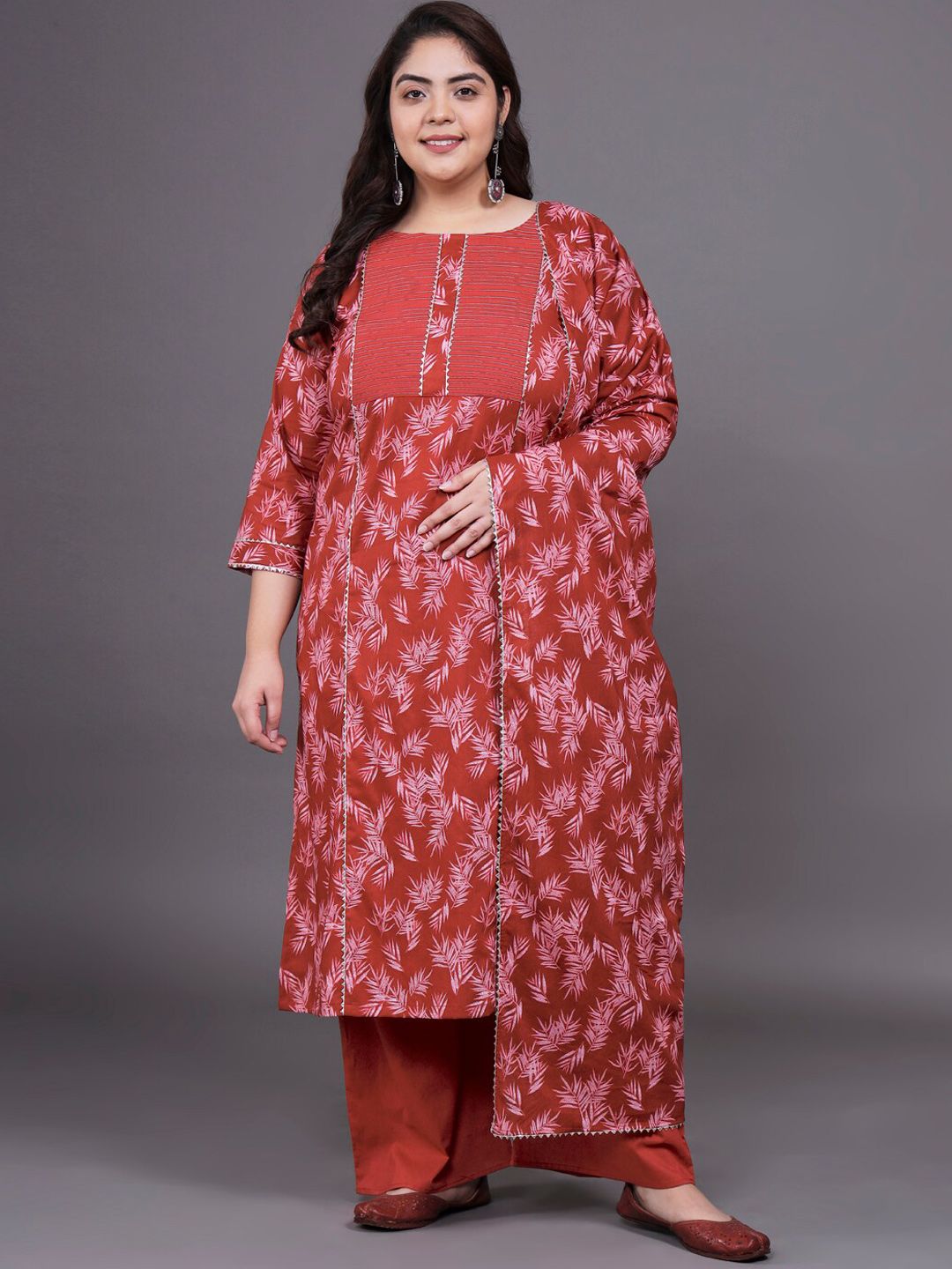 Plus Size Floral Printed Pure Cotton Straight Kurta With Palazzos & Dupatta