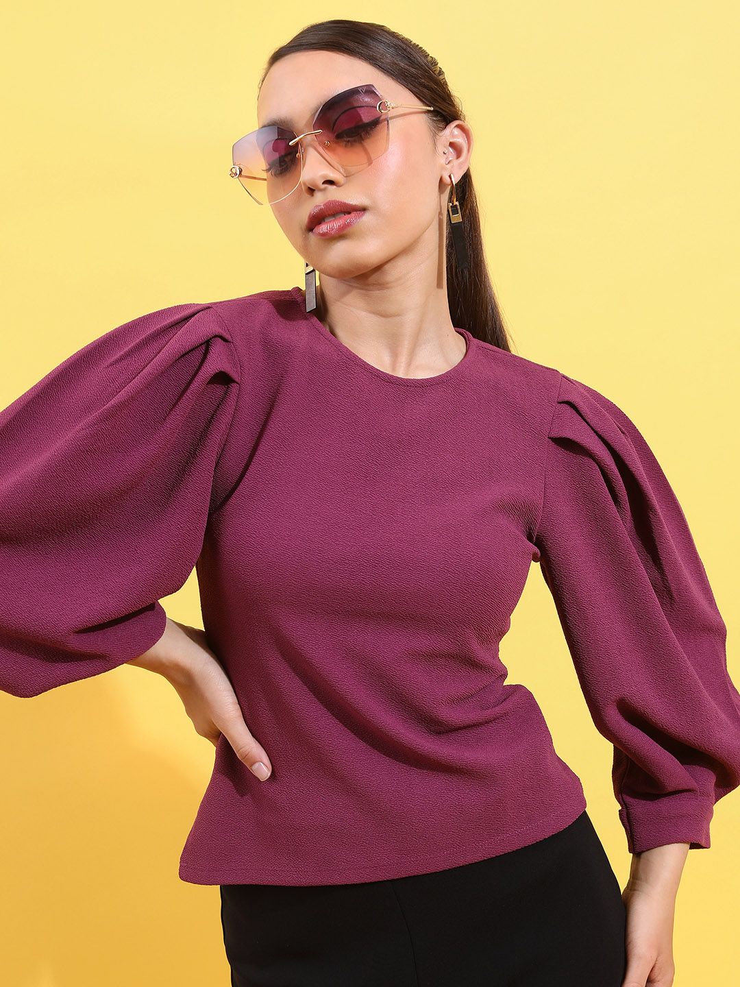 Women Rust Pink Solid Puff-Sleeve Regular Top