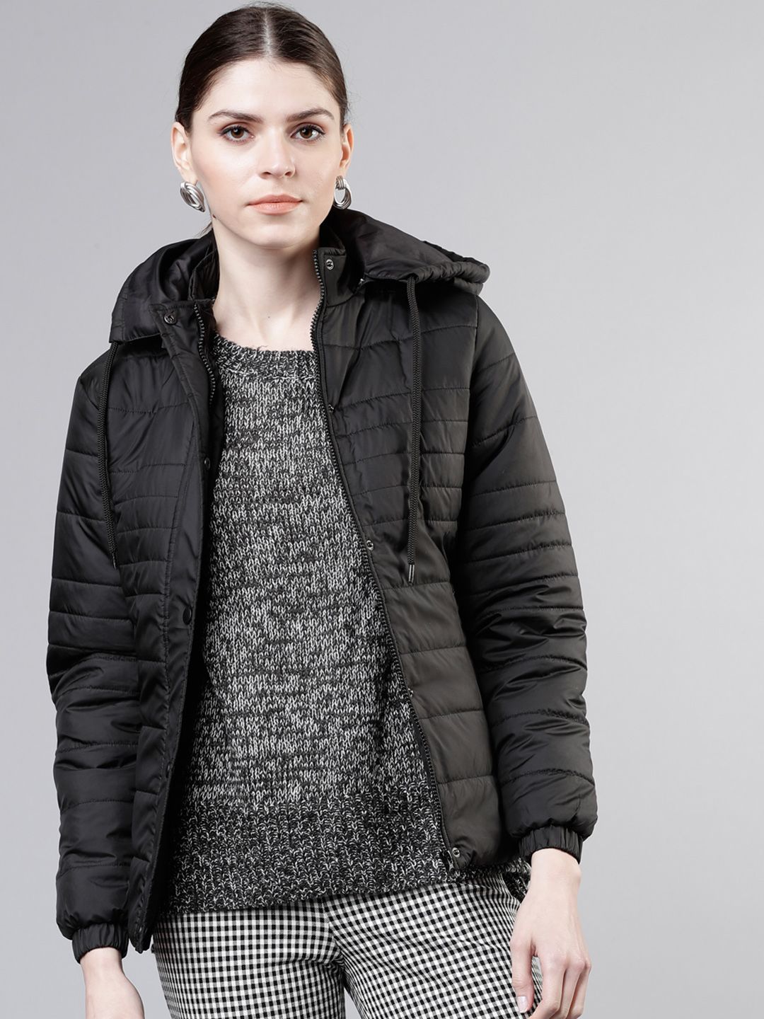 Women Black Full Sleeve Mock Neck Padded Jacket