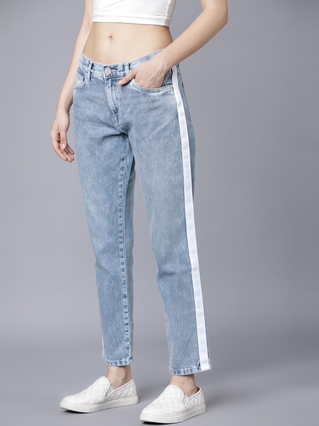 Women Blue Boyfriend Fit High-Rise Clean Look Stretchable Side Striped Jeans