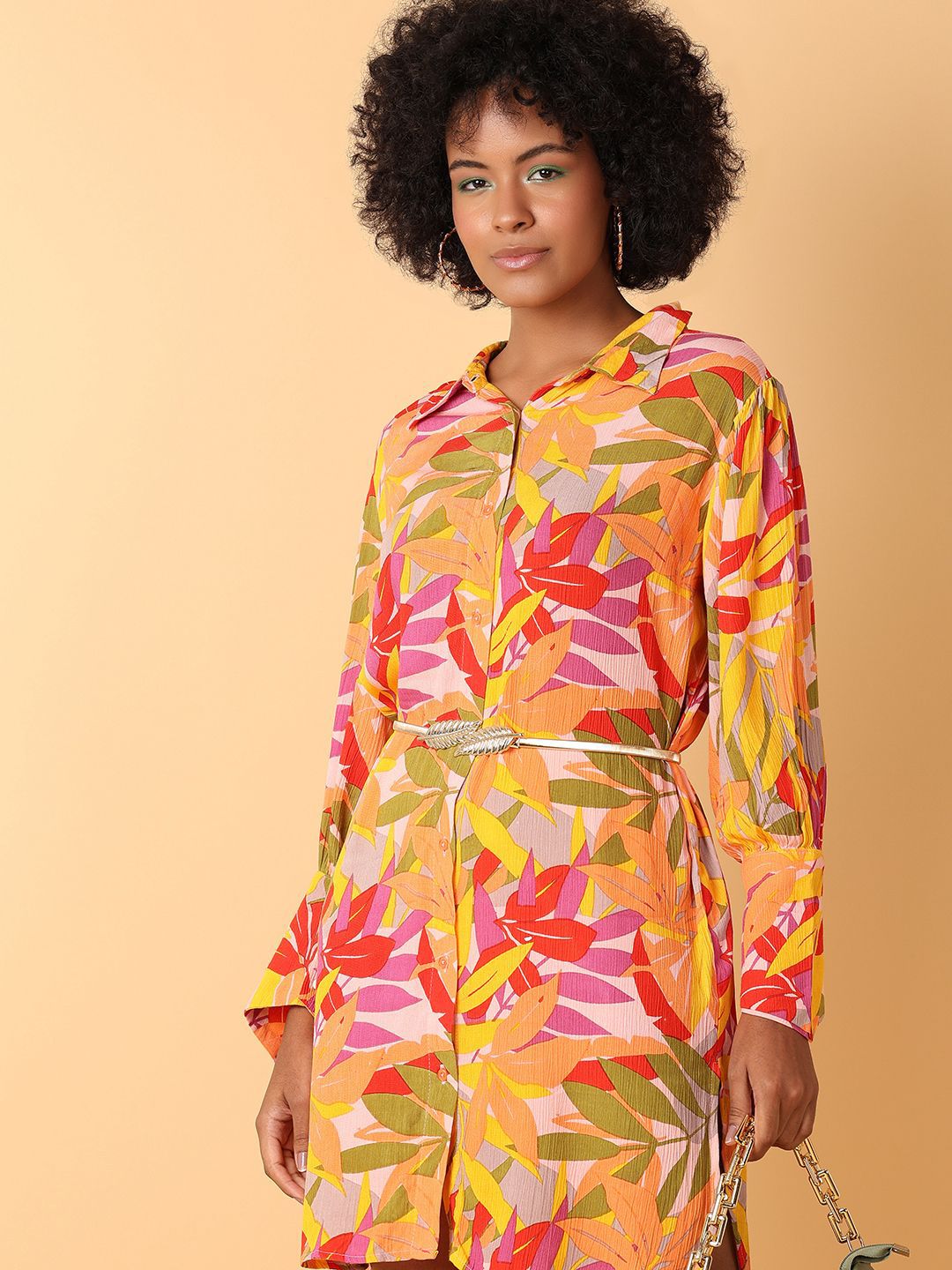 Rust & White Floral Printed Spread Collar Belted Casual Shirt