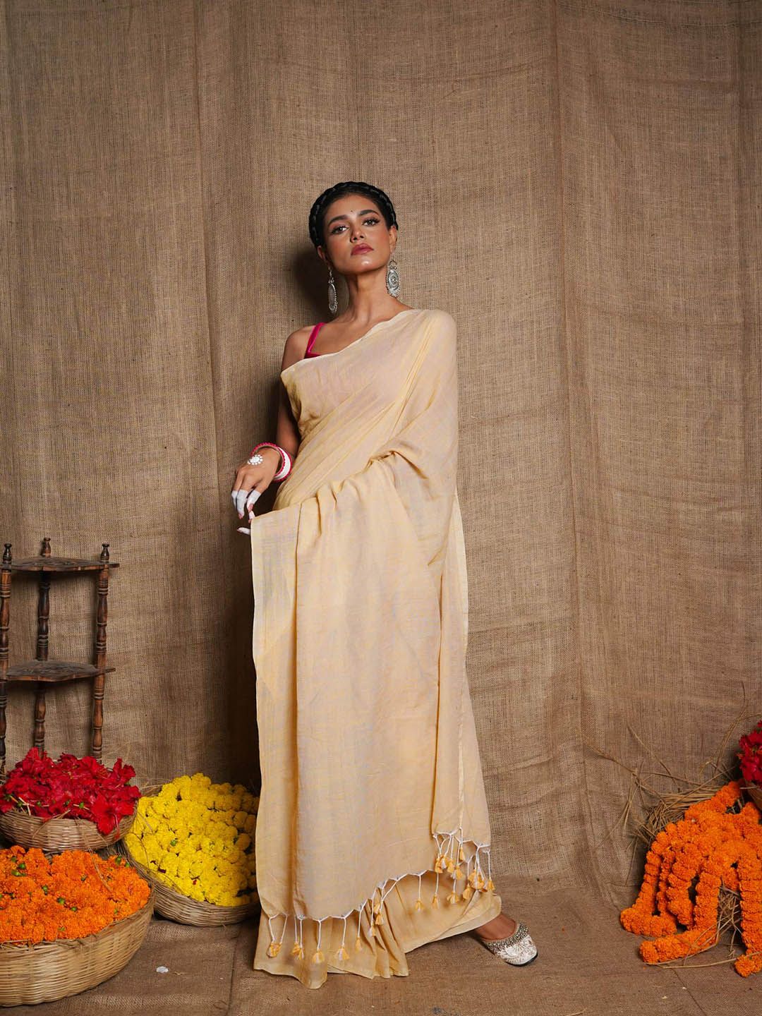 Beige & Off White Zari Woven Design Linen Blend Saree