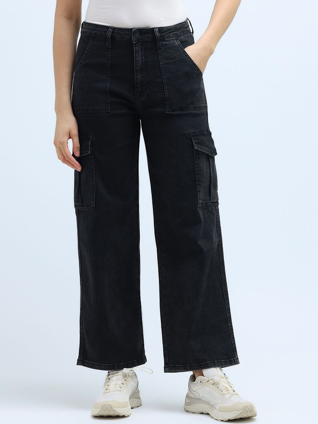 Women Smart Wide Leg High-Rise Clean Look Stretchable Cargo Jeans