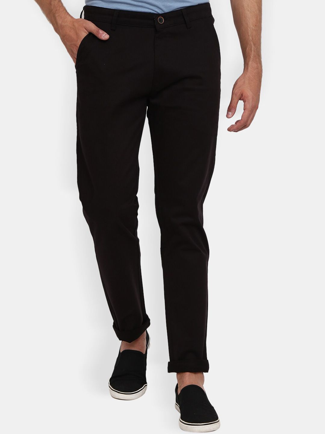 Men Black Mid Rise Slim Fit Easy Wash Cotton Chinos Trousers