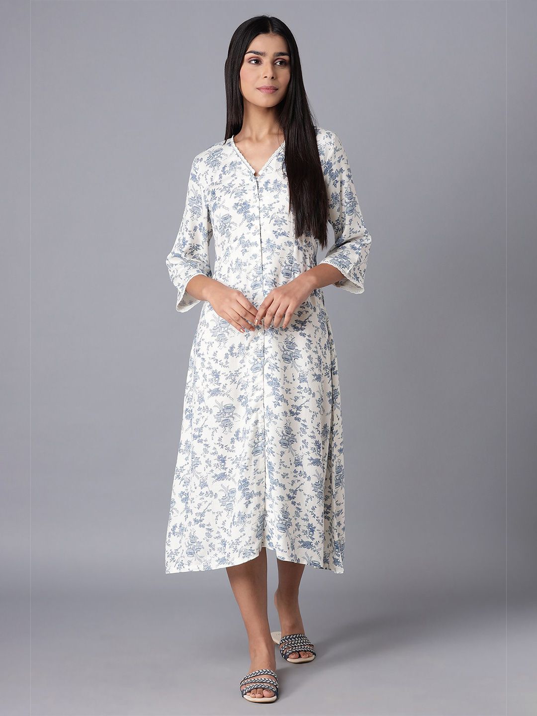 Off hite & Green Floral Print Keyhole Neck Ethnic A-Line Midi Dress