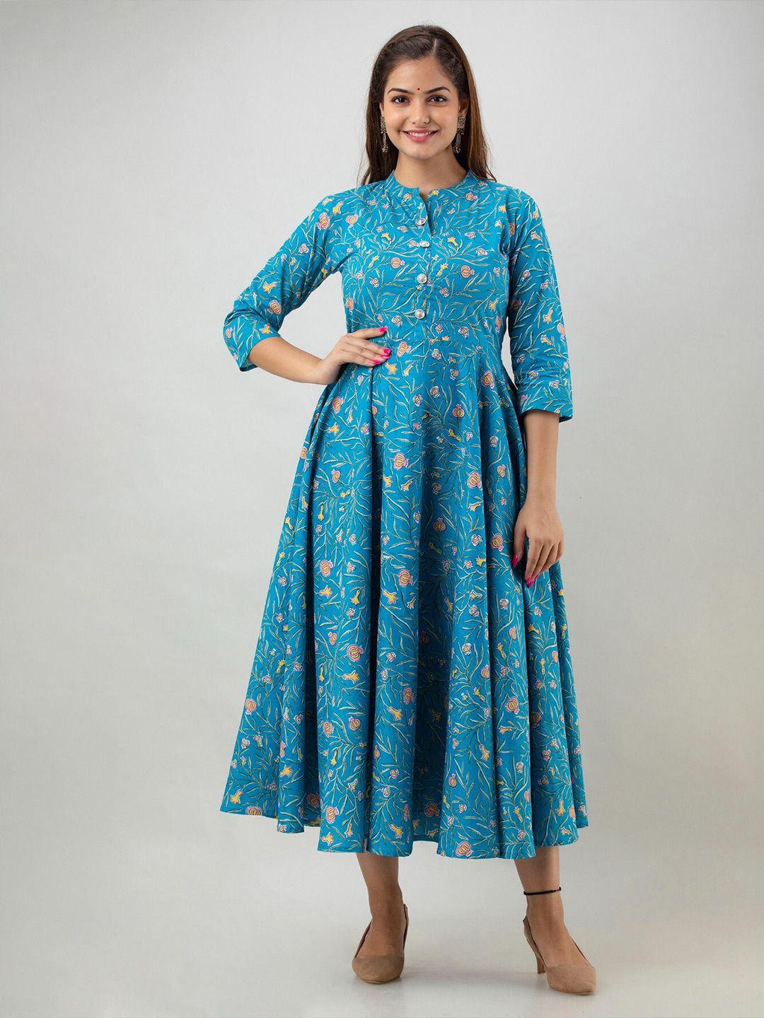 Floral Print Mandarin Collar Cotton Fit & Flare Ankle Length