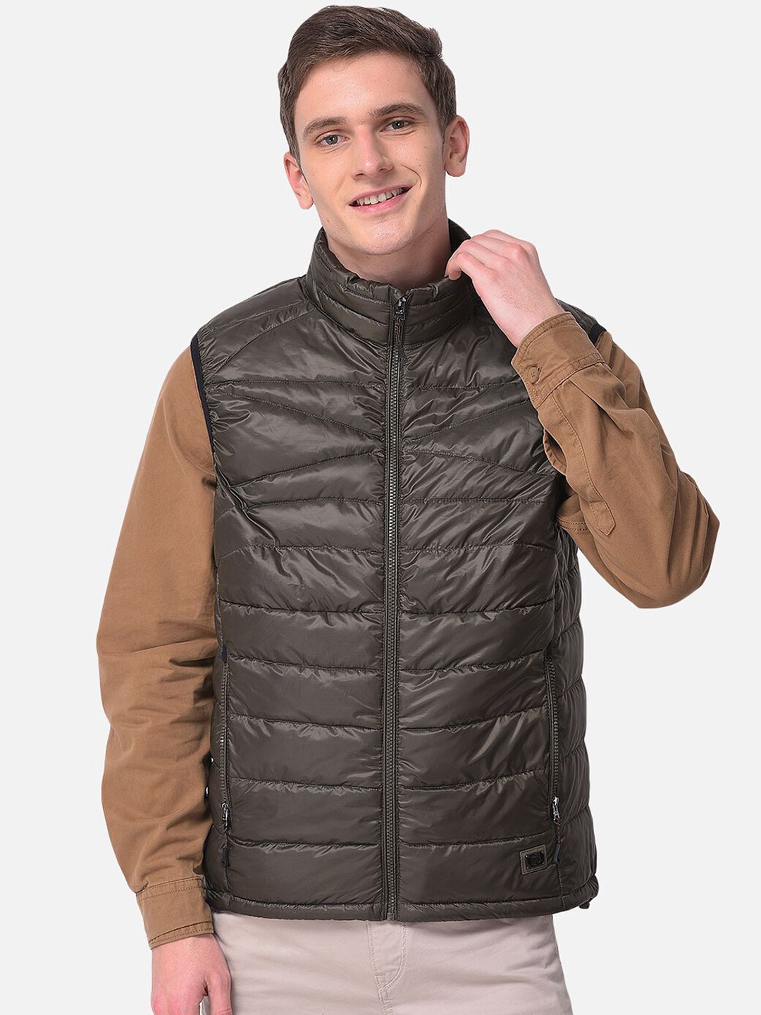 Men Olive Green Solid Sleeveless Puffer Jacket