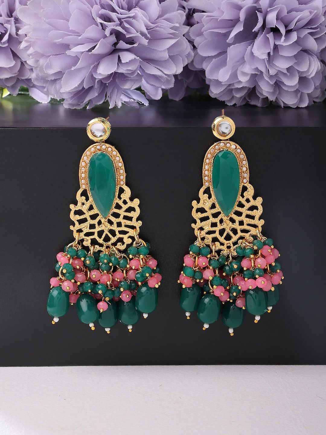 Green & Gold-Plated Handcrafted Kundan Geometric Drop Earrings