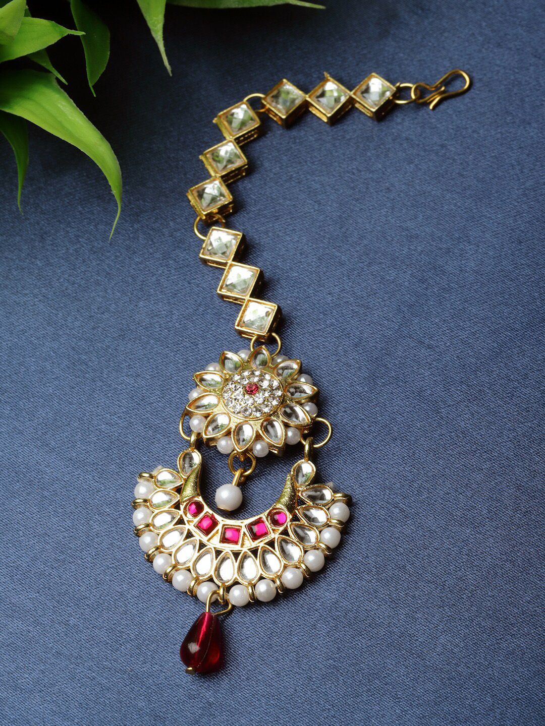 Women Gold-Toned & Maroon Kundan & Pearl Studded Maang Tikka