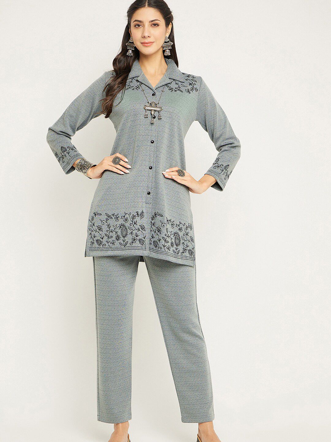 Floral Embroidered Mandarin Collar Acrylic Tunic With Trouser Co-Ords