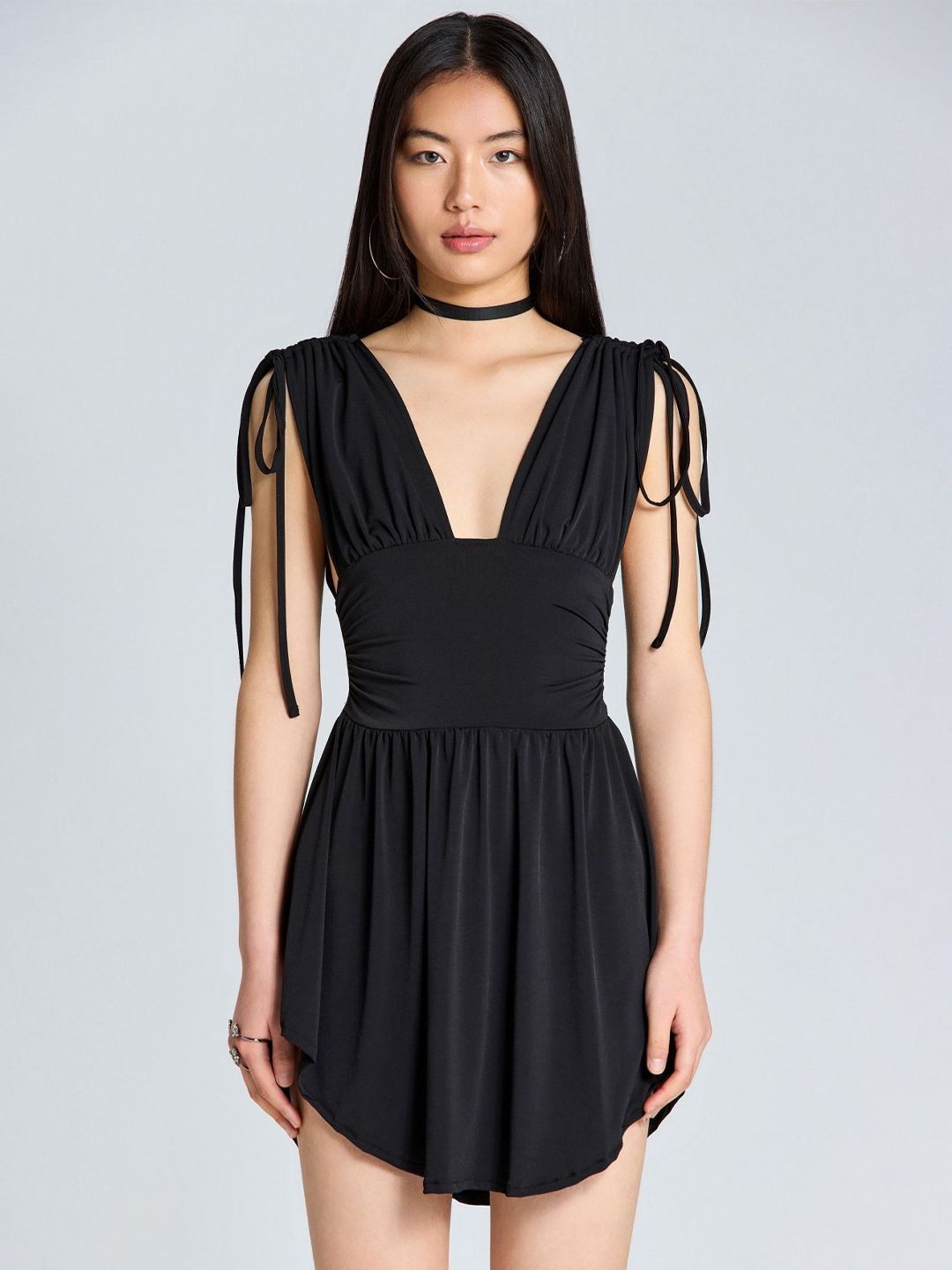 Black Shoulder Straps Gathered or Pleated Wrap Dress